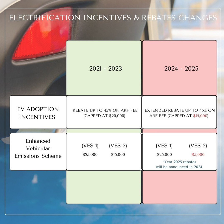 Singaporean car owners face the dual challenge of coping with soaring COE prices while grappling with reduced government incentives for electric cars and VES Band A2 vehicles after 31 December 2023. Particularly for those with COEs expiring in 2023 or the next two years, navigating this inevitable struggle becomes crucial. The Electric Vehicle (EV) Adoption Incentive rebate on the Additional Registration Fee (ARF) tax, originally planned to last until 31 December 2025, will now be extended for another two years, albeit with a lowered incentive cap of $15,000 (down from $20,000).