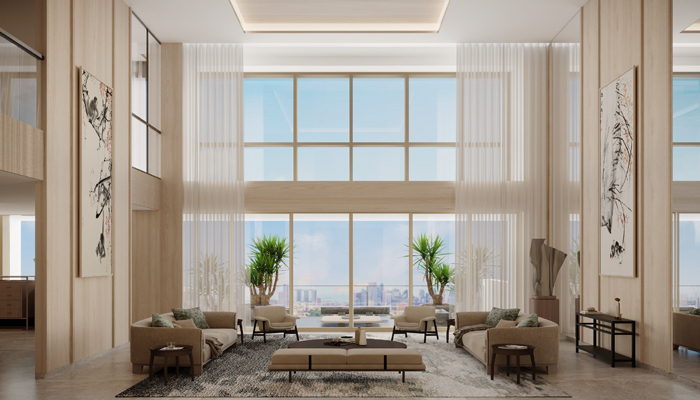 Residential units begin from the 6th floor upwards, boasting quality marble flooring in living, dining, and dry kitchen areas, complemented by engineered timber flooring in the bedrooms. Each unit is equipped with high-quality fittings and appliances. Typical units feature a ceiling height of 3.25m in living, dining, and bedrooms. Among the two rare penthouse units, one offers a unique double-volume space in the living hall with a ceiling height of approximately 6.5m, while the other boasts a generous single-level floor plate size of 4,898 sq ft.