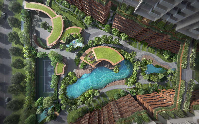 Level 1 hosts a variety of facilities, including swimming pools, a clubhouse, yoga deck, and playground. Sky terraces on Levels 8 & 9 provide workspaces while the roof features a Sky Dining Pavilion with stunning views.