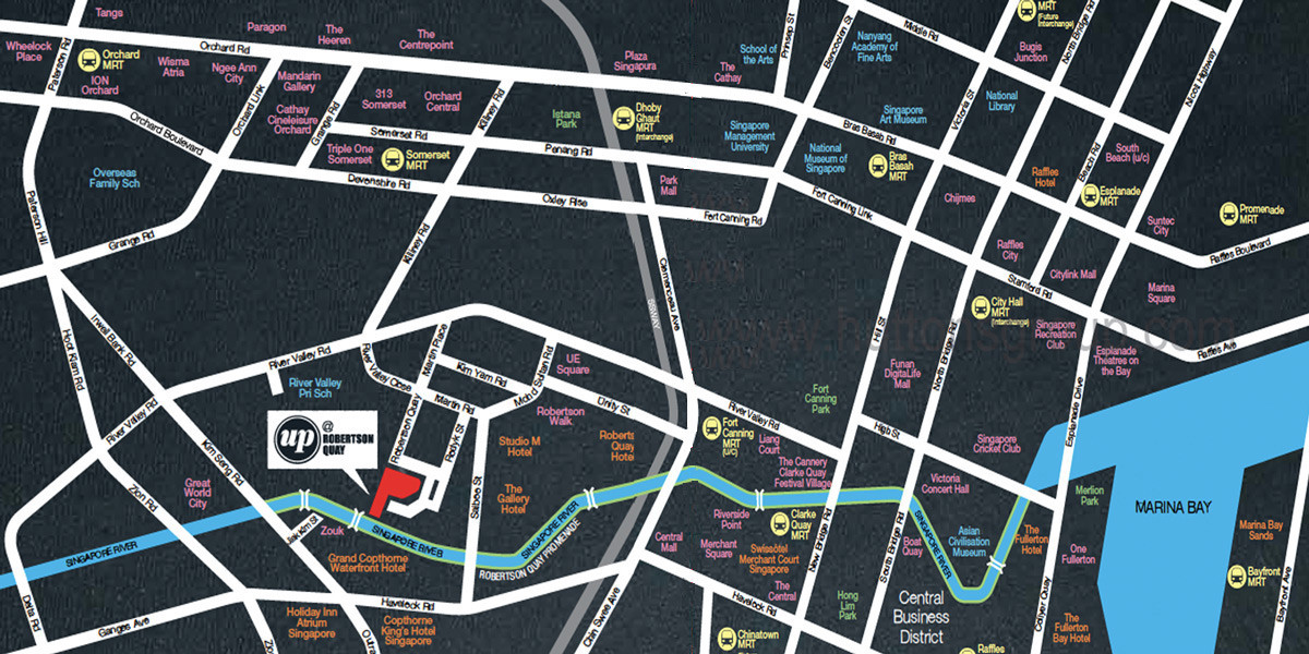 The UP@ Robertson Quay is within 400m and 550m away from the future Havelock and Great World MRT stations respectively. Bus stops are also a mere 2 minutes walk away. Nearby shopping malls and supermarkets include Great World City, Robertson Walk, the Central and UE shopping mall. Schools that are near this development are River Valley Primary, Zhangde Primary, Alexandra Primary, Outram Secondary, Singapore Management University (SMU) and the School of The Arts (SOTA).