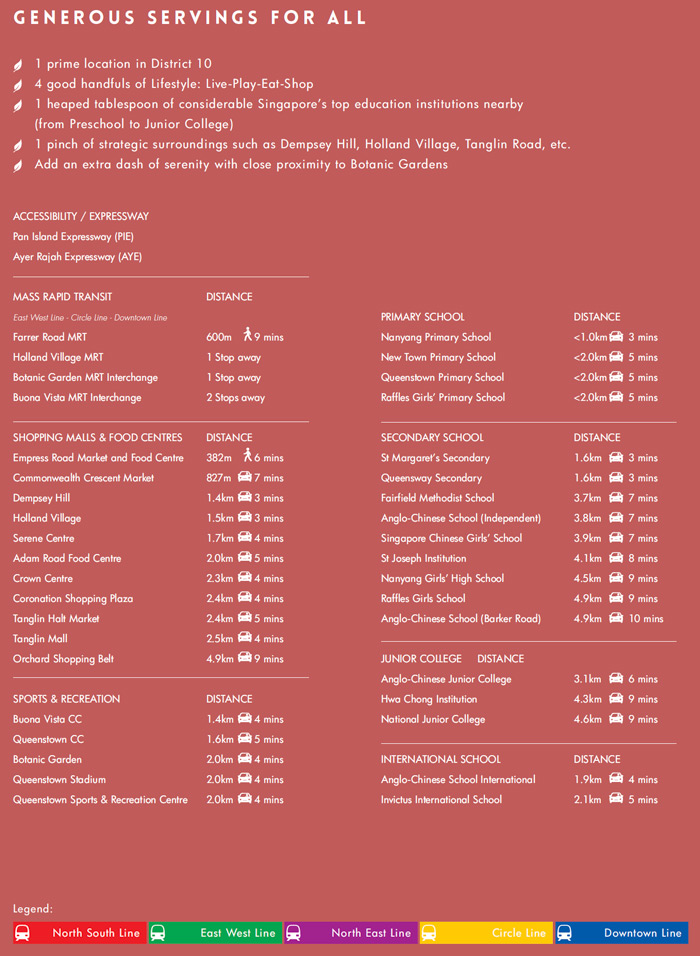 If you’re in need of some retail therapy, Coronation shopping plaza, Orchard shopping belt, Tanglin mall, and Tanglin halt market are nearby places you can consider. All these shopping centers are less than 10 minutes’ drive away.